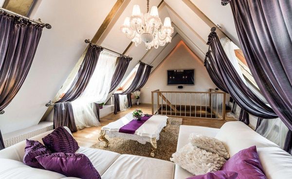 Дано: перед нами мансарда – помещение с ломанным потолком, небольшими окнами в торце или крыше. Это помещение может быть слишком жарким из-за того, что напрямую граничит с крышей, а также и потому, что нет возможности грамотной драпировки окон. Нам как специалистам по текстилю особенно интересно разобраться именно с декорированием оконных проемов.